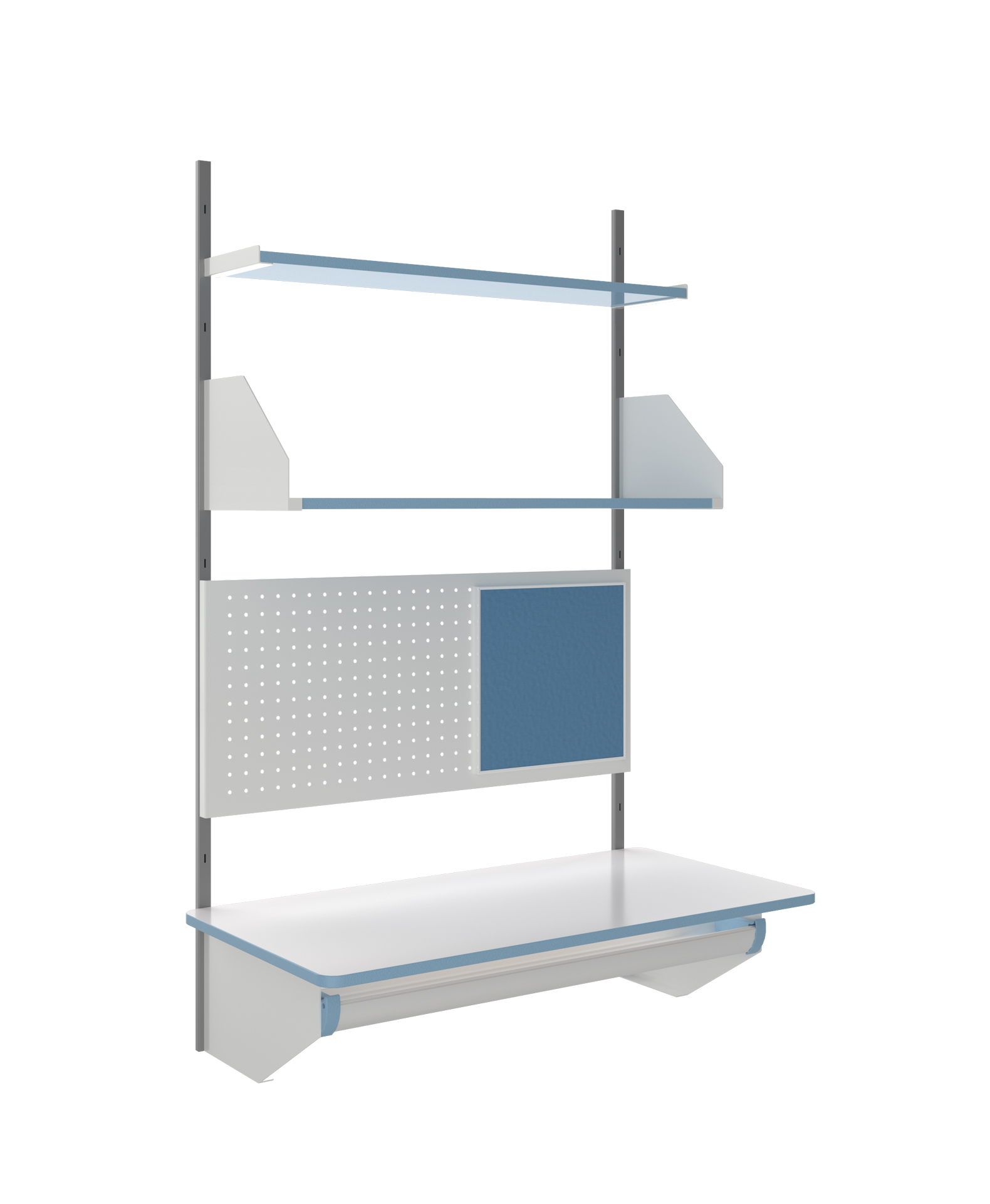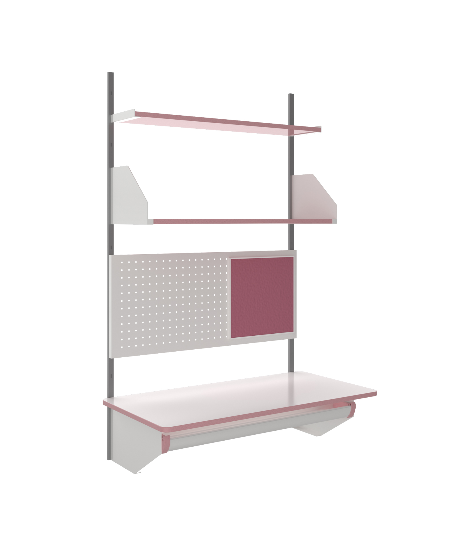 • Cụm 04: 01 giá W900*D200mm + 01 giá W900*H220*D300mm + 01 bảng cài W900*H400mm + 01 bảng ghim W350*H350mm + 01 mặt bàn W1000*H250*D500mm.