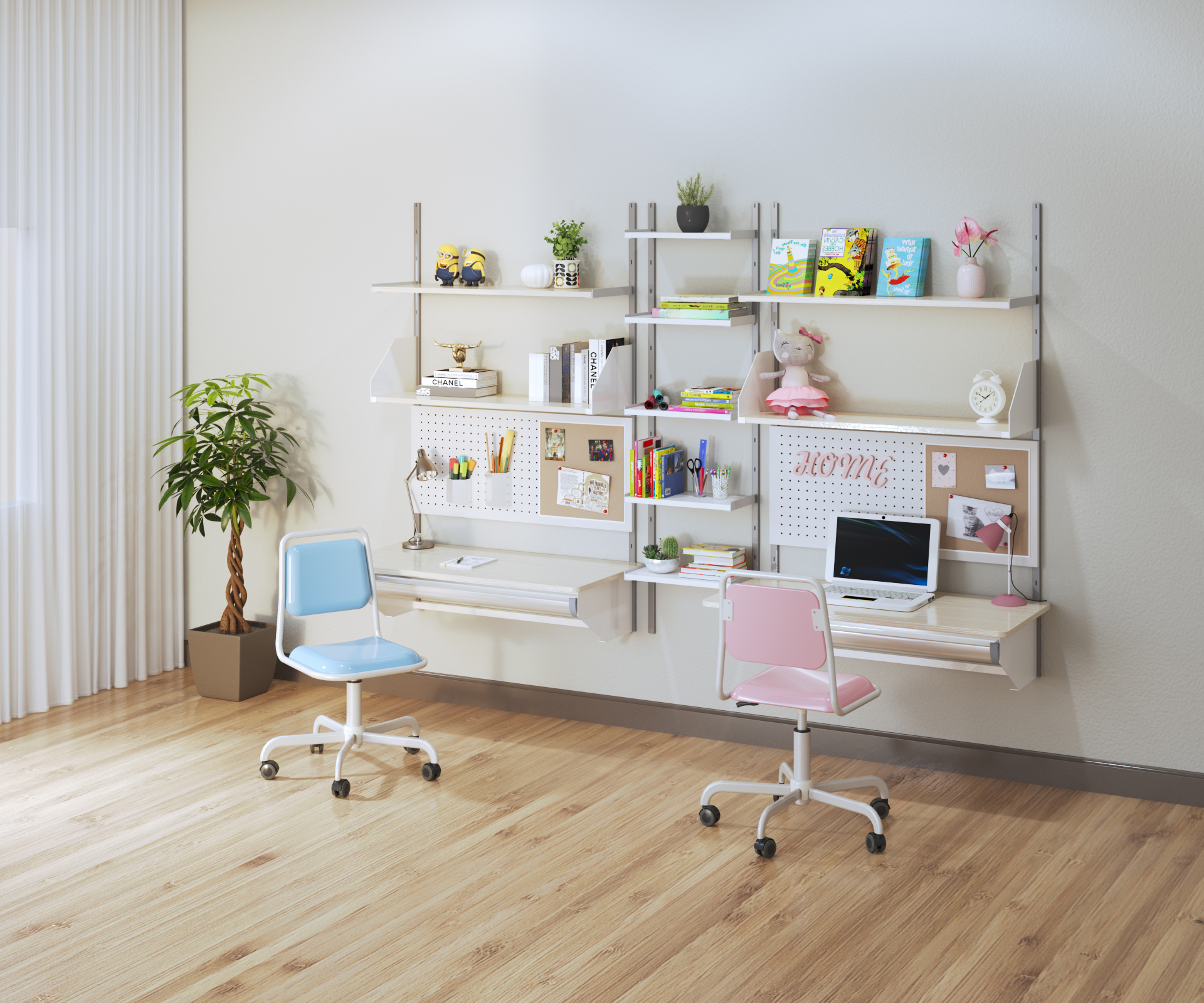 • Bố trí hai không gian học tập song song, tối ưu diện tích và vẫn đảm bảo mỗi bé có không gian riêng.